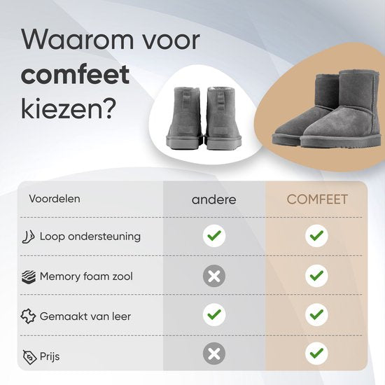 Vous cherchez de nouvelles pantoufles ? Vous détestez avoir les pieds froids ? Découvrez les pantoufles de Comfeet. Enfilez-les. Grâce à la doublure en fausse fourrure et à la semelle en mousse à mémoire de forme, vos pieds seront merveilleusement chauds en 5 minutes. Détendez-vous. Réchauffez-vous. La semelle en mousse à mémoire de forme vous permet de marcher pendant des heures sans ressentir de douleurs aux genoux ou aux pieds. Une petite sortie ? Faites ce que vous avez à faire. La semelle en caoutchouc antidérapante évite de glisser ou d'avoir mal aux pieds. Pour l'intérieur et l'extérieur. Quelle que soit l'agitation de la journée, Comfeet vous permet de vous réchauffer, de vous détendre et de vous relaxer. 1) Facile à mettre et à enlever Grâce au matériau résistant, vous mettez ou enlevez votre pantoufle rapidement. Vous pouvez donc changer de chaussures à tout moment sans problème. Entrez. Vous êtes à la recherche d'un petit quelque chose ? Faites ce que vous avez à faire. La semelle en caoutchouc antidérapante empêche de glisser et se nettoie facilement et rapidement après usage. 2. Douceur et chaleur Grâce à la doublure en polaire et à l'assise plantaire en mousse à mémoire de forme, chaque pas est comme une promenade sur les nuages. Prévient les irritations et les démangeaisons de la peau et des pieds. Vos pieds restent donc au chaud quelle que soit la température extérieure óf intérieure. Adieu pieds froids. Bonjour le plaisir de la chaleur. 3. Nettoyage rapide La semelle en caoutchouc empêche la saleté de pénétrer et la chaleur de rester à l'intérieur. Les chaussures sont sales ou ne sentent plus la fraîcheur ? Mettez-les simplement dans la machine à laver et lavez-les à 30 degrés. Ils sentiront à nouveau le frais en un rien de temps. Et ils auront immédiatement l'air tout neufs. Prêts pour la prochaine aventure de course à pied. 4. Soyez au chaud. Sentez-vous bien. Souffrir du froid, c'est affreux. Nous nous sentons mal, nous restons raides et nous avons des crampes plus longtemps, ou pire, cela perpétue les douleurs articulaires ou musculaires. Prévenez cela en réchauffant vos pieds et en les gardant au chaud grâce à vos comfeets. Avantages : Prévient les réactions cutanées Se promener sans douleur Pour l'intérieur et l'extérieur Convient comme cadeau Facile à mettre et à enlever Avez-vous déjà essayé sans succès : 1. de mettre des chaussettes supplémentaires 2. de mettre vos pieds sur le chauffage 3. d'utiliser des poêles à frire Alors pourquoi vous sentiriez-vous mal avec des pieds glacés plus longtemps ? Alors que vous pouvez aussi les avoir agréables, confortables mais surtout chauds avec Comfeet ? La garantie Comfeet : vous n'êtes pas satisfait dans les 60 jours suivant la réception, quelle qu'en soit la raison ? Dans ce cas, vous pouvez vous faire rembourser en renvoyant vos pantoufles à bol.com. Caractéristiques : Matière : fausse fourrure & ; daim Tailles : 36 à 42 Couleur : Châtaigne / Noir / Gris Semelle : Semelle dure Hauteur de la chaussure : Haute Type : talon fermé