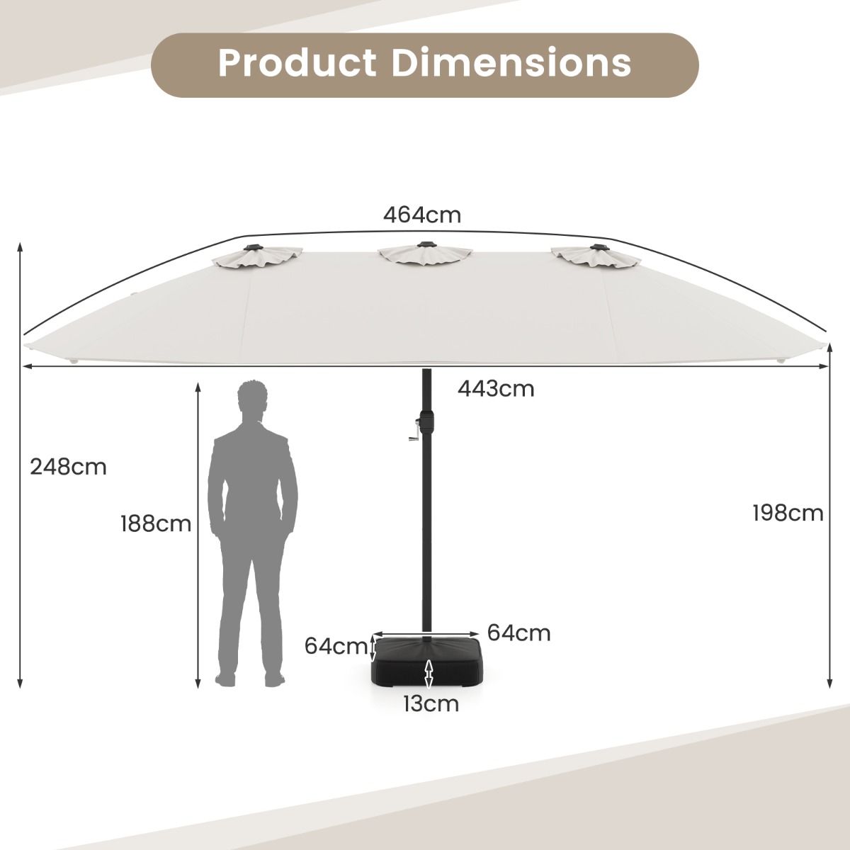 - Dimensions de la base du parasol : 64 x 64 x 13 cm (L x L x H)