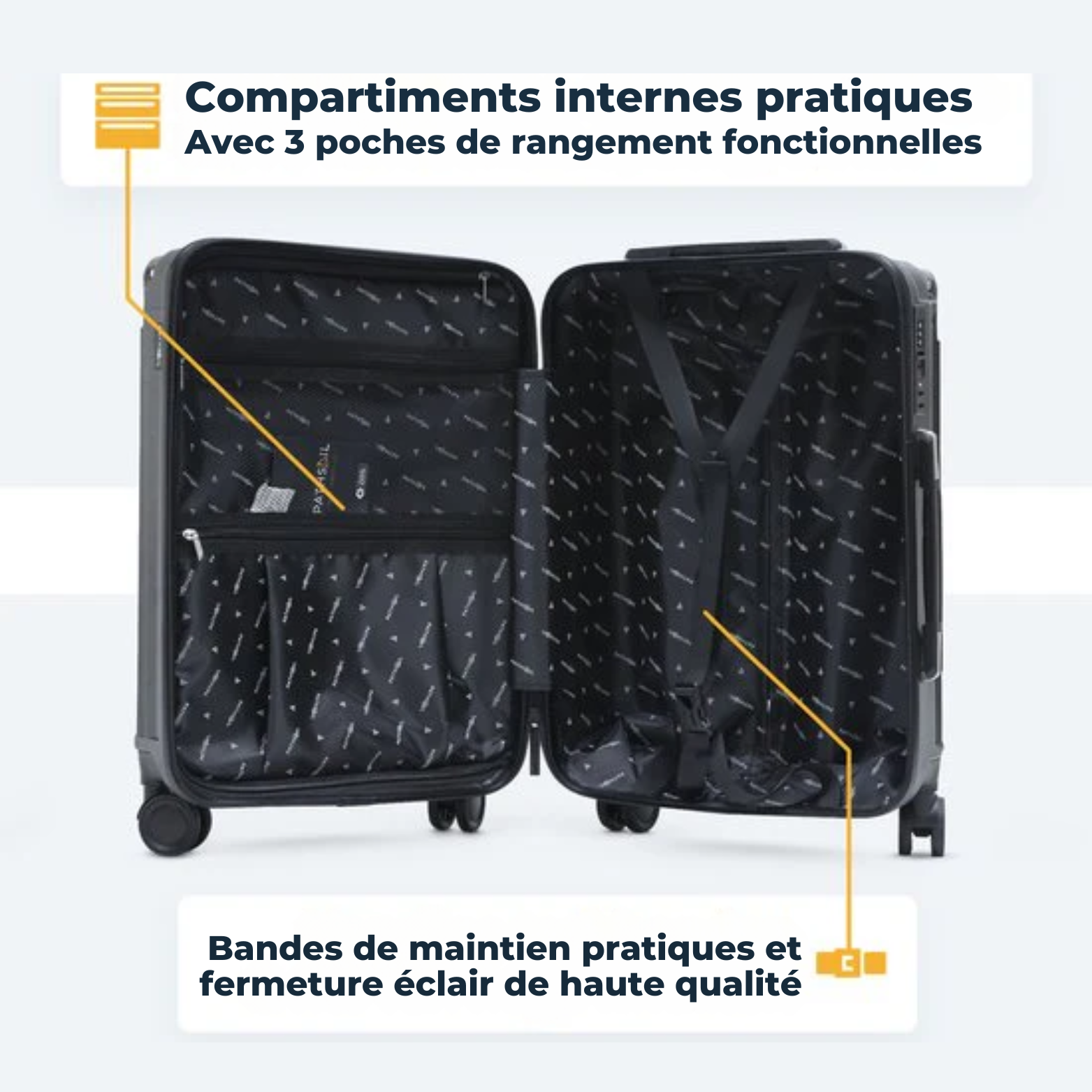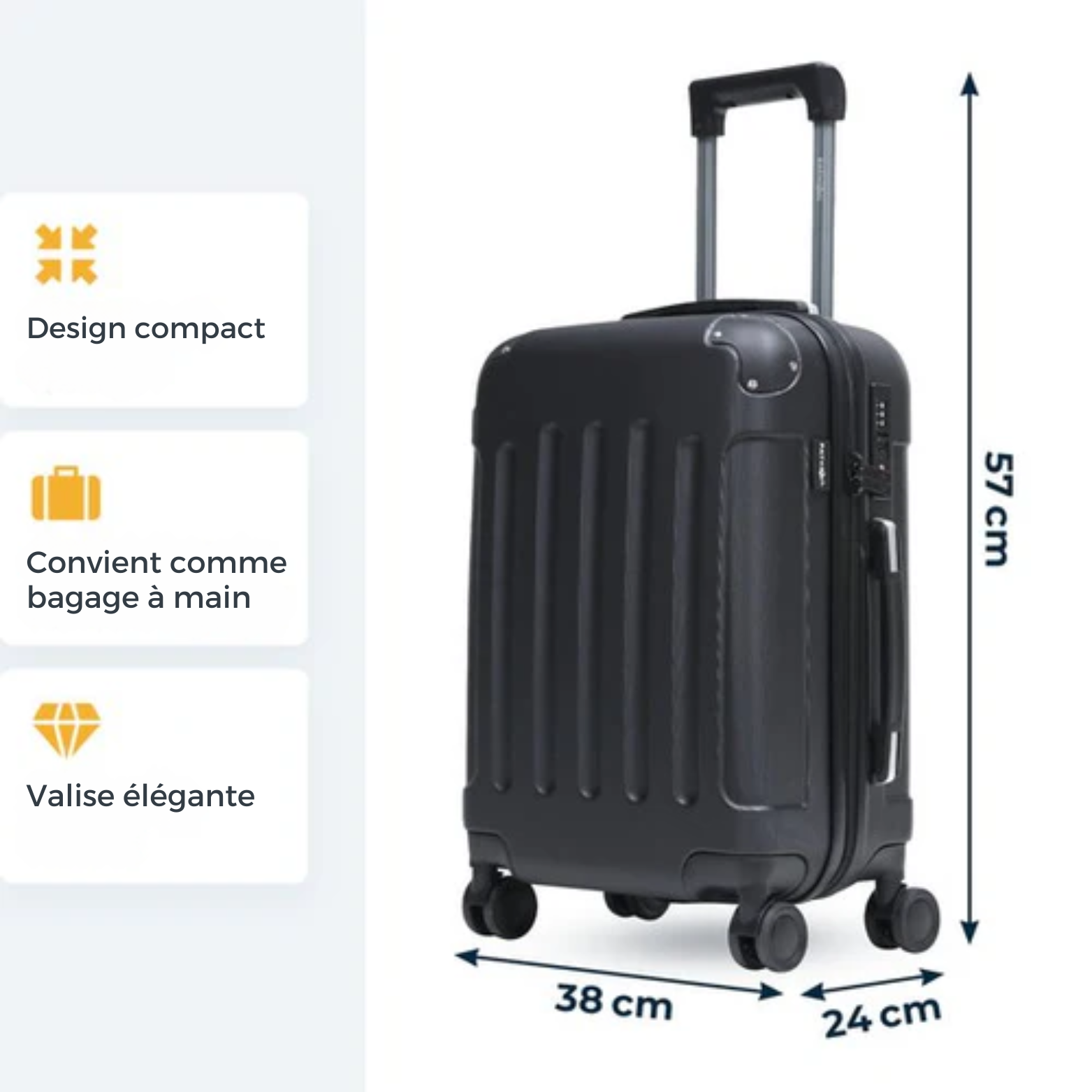 Dimensions cabine : 38 x 24 x 57 cm, compatibles avec la majorité des compagnies aériennes