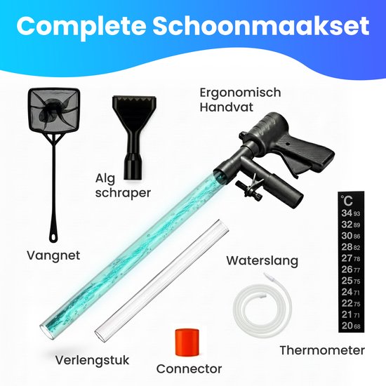 Le nettoyeur d'aquarium Pawesome est conçu pour une utilisation polyvalente. Avec lui, vous pouvez enlever la saleté du fond, aspirer les déchets, changer facilement l'eau, gratter les algues sur la vitre et attraper les poissons en toute sécurité grâce à l'épuisette incluse. Tout ce dont vous avez besoin pour un aquarium propre et sain est inclus dans cet ensemble.