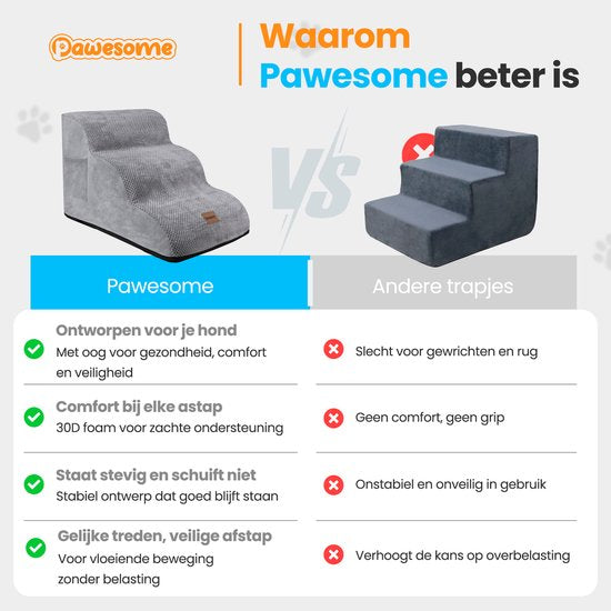 Chez Pawesome, les besoins de votre animal de compagnie sont primordiaux. Nos produits sont conçus pour rendre la vie plus facile, plus sûre et plus confortable pour vous et votre animal. L'Escalier pour chien Pawesome est un investissement rentable pour le bien-être de votre compagnon à quatre pattes et une solution pratique pour une utilisation quotidienne.