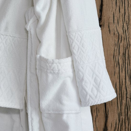 Après une douche revigorante ou un bain relaxant, ou pour se réchauffer au lever du lit le matin. Parfait pour se blottir dans le canapé. Le 100% coton merveilleusement doux vous donne envie de le porter toute la journée. Les manches et les poches sont ornées d'une bordure luxueuse et d'un magnifique motif graphique tissé en jacquard, ce qui confère au peignoir une allure chic et élégante. Le nom Riviera Maison est subtilement brodé sur la ceinture. Ce peignoir est disponible en différentes couleurs et tailles. De plus, le peignoir est livré dans un luxueux coffret cadeau, un merveilleux cadeau pour vous-même ou pour un être cher. La boîte est réutilisable ou facilement recyclable.