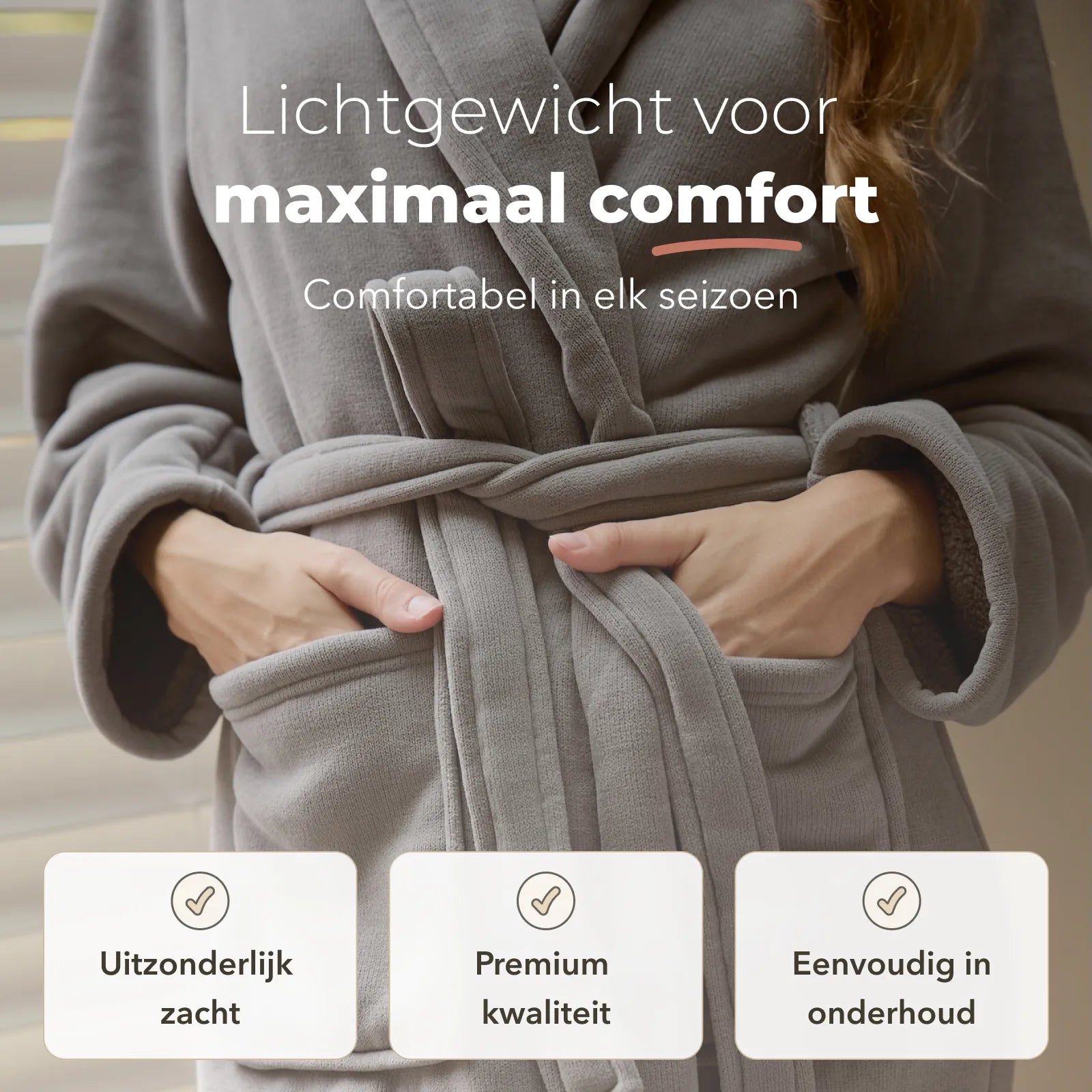 Grâce à ses propriétés thermorégulatrices, le peignoir s'adapte sans effort à votre moment. Il vous garde bien au chaud lorsque vous en avez besoin et reste agréablement respirant lorsque vous vous détendez. Doux pour les peaux sensibles, il est agréable à porter toute l'année.