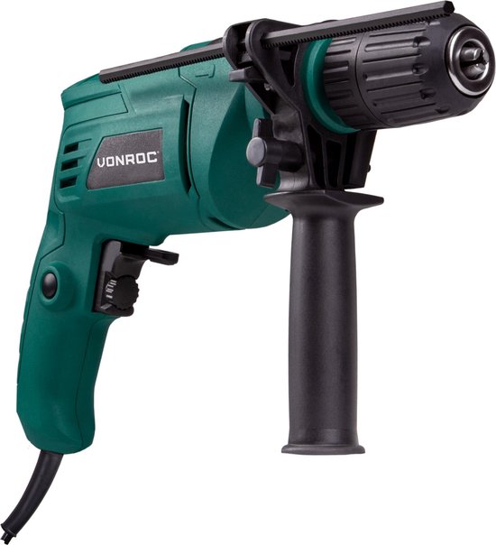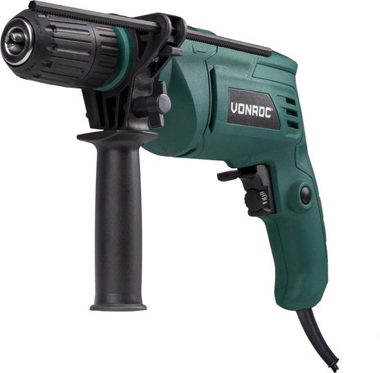 VONROC Perceuse à percussion - 500W - Mandrin rapide - Poignée latérale, butée de profondeur et sac de rangement inclus
