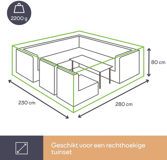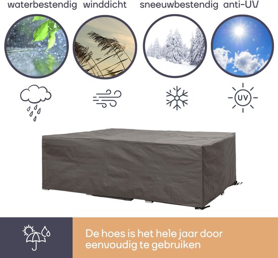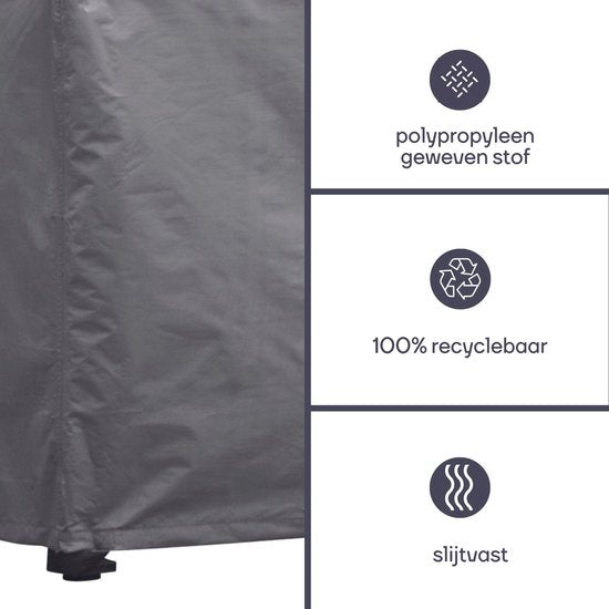 Vous souhaitez profiter pleinement de vos meubles de jardin et prolonger leur durée de vie autant que possible ? Il est alors nécessaire de protéger votre parasol, vos chaises et autres meubles de jardin des intempéries, de la décoloration, des rayons UV, des dépôts verts, de la poussière et de la saleté. Une housse de protection les garde propres et secs pendant l'hiver et vous permet de profiter à nouveau de votre jardin au printemps. Cette housse de protection est fabriquée en polypropylène tissé, imperméable et inaltérable, et offre la meilleure protection pour votre mobilier de jardin. La housse est facile à manipuler tout au long de l'année. Bien qu'une légère décoloration puisse se produire au fil du temps en raison des rayons UV, vos précieux meubles resteront bien protégés.