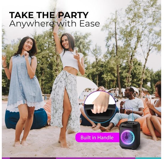 Le show lumineux intégré pulse au rythme de la musique, et avec la prise micro 6,3 mm, vous pouvez facilement le transformer en une soirée karaoké. Grâce à la batterie rechargeable, vous pouvez profiter de 7 heures de musique et la manette pratique vous permet d'emporter le haut-parleur partout.