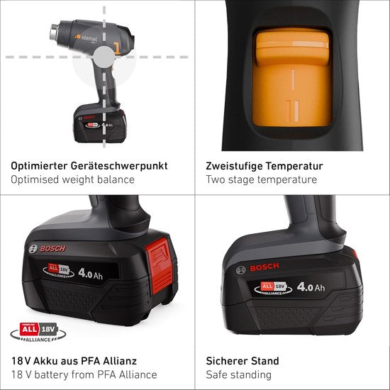 - Parfait pour enlever sans fil les autocollants et les étiquettes, réparer ou sertir les câbles électriques, ou encore desserrer et réparer. En 14 secondes, il chauffe jusqu'à 300°C. La température est réglable en 2 étapes à 300°C ou 450°C. Débit d'air de 120 litres par minute pour une utilisation efficace. Compatible avec le système de batterie 18V BOSCH POWER FOR ALL pour une flexibilité optimale.