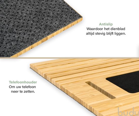 Budu Plateau d'accoudoir pour canapé - Flexible - Organisateur d'accoudoir - Bois de bambou - Antidérapant - Porte-téléphone