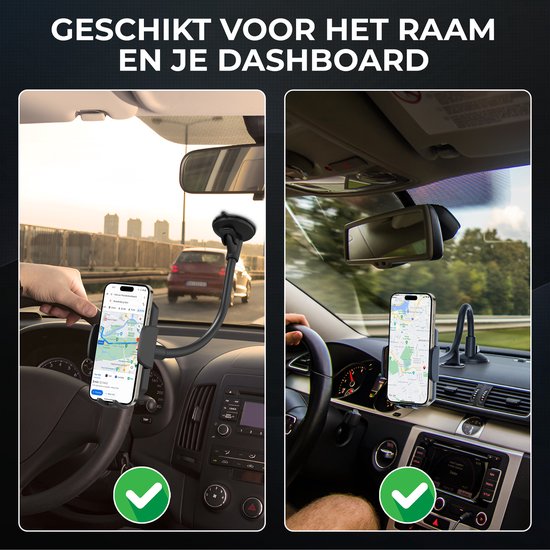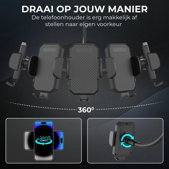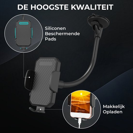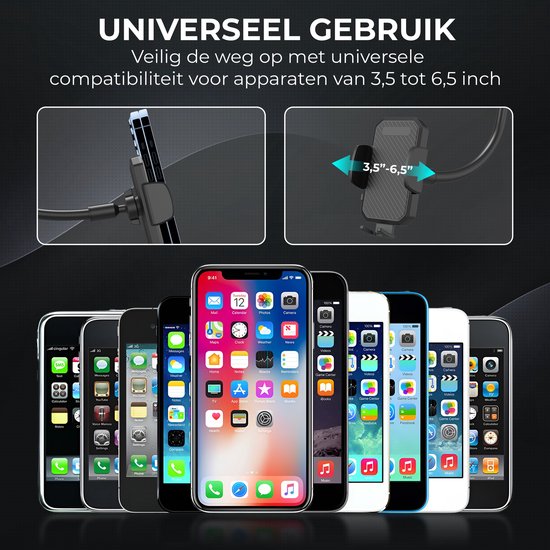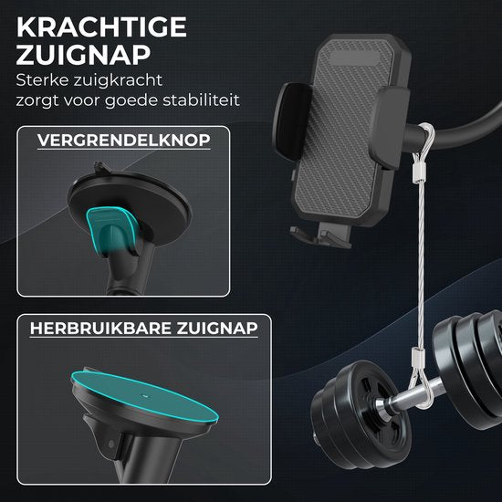 Ce support de téléphone pratique maintient votre smartphone en place en toute sécurité lorsque vous êtes en voiture. Vous pouvez ainsi téléphoner les mains libres et naviguer en toute tranquillité ! Ce support se fixe facilement sur le pare-brise ou le tableau de bord. Grâce à la puissante ventouse, vous franchirez sans peine tous les obstacles sans que votre téléphone ne se détache. De plus, un bouton pratique permet un décrochage rapide.