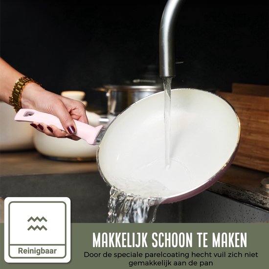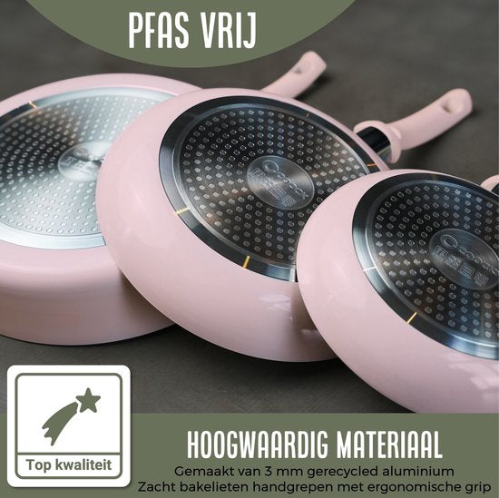 Fabriquée en aluminium 100 % recyclé et dotée d'un revêtement antiadhésif en céramique durable, la poêle à frire rose Coock est le choix idéal pour les cuisiniers soucieux de l'environnement. Cette poêle durera des années, réduisant ainsi la nécessité d'en acheter une nouvelle et votre impact écologique. Le revêtement en céramique est sans substances nocives telles que PFOA et PTFE, ce qui vous permet de cuisiner en toute sérénité.