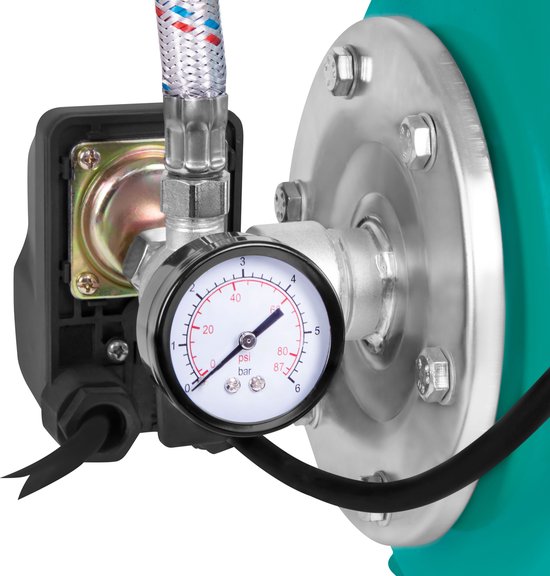 Cette pompe hydronique est équipée d'un contacteur de pression et d'un réservoir de 19 litres : lorsque la pression baisse (en raison de la consommation d'eau), la pompe s'enclenche automatiquement à 1,4 bar et s'arrête à nouveau à 2,6 bars. Grâce au réservoir, la pompe ne se met pas immédiatement en marche en cas de faible demande d'eau, mais peut d'abord utiliser le volume d'eau stocké. En outre, la pompe ne se met pas constamment en marche et à l'arrêt lorsque de petites quantités (telles que des goutteurs) sont constamment prélevées. Un manomètre est également inclus, ce qui permet de lire clairement la pression actuelle.