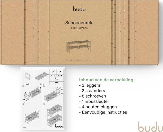 - Veuillez noter : le porte-chaussures Budu à 2 couches n'est pas compatible avec le porte-chaussures Budu à 3 couches. Cependant, deux étagères à chaussures à 2 couches s'adaptent parfaitement ensemble.
