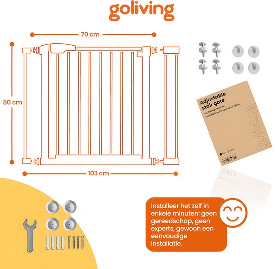 La barrière d'escalier Goliving est livrée avec deux extensions (7 cm et 14 cm), ce qui lui permet de s'adapter aux passages de 75 à 103 cm. qui lui permettent de s'adapter à des passages de 75 à 103 cm de large. Cela vous permet d'adapter facilement la barrière d'escalier à presque toutes les portes ou couloirs de la maison, sans devoir utiliser d'outils supplémentaires.