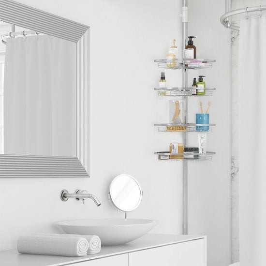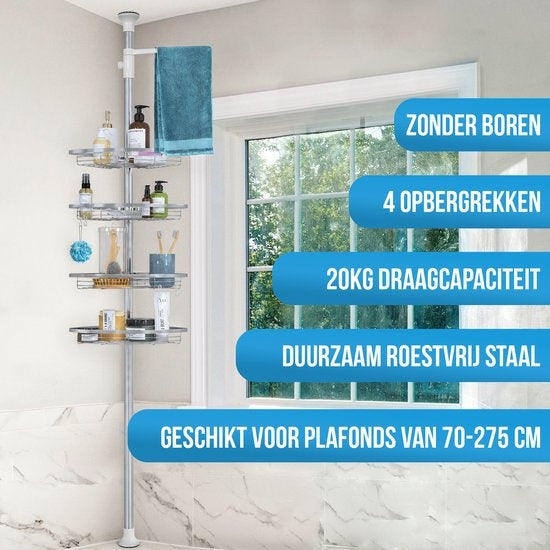 Porte-douche télescopique Strex en acier inoxydable - réglable 70-275 cm - 4 paniers - qualité robuste - fixation sans perçage ni vis - Porte-douche télescopique d'angle