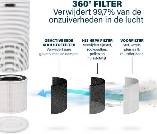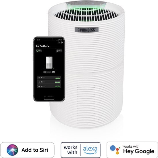 Vous aimeriez pouvoir contrôler vous-même la qualité de l'air dans votre maison ? Le purificateur d'air intelligent Princess 356280 est le choix idéal pour vous. Ce purificateur d'air est doté d'un indicateur de qualité intégré avec code couleur et de trois systèmes de filtrage différents. Le pré-filtre retient les cheveux et la poussière (fine), tandis que le filtre à charbon actif élimine les odeurs indésirables. En outre, le filtre HEPA H13 élimine les microparticules, contribuant ainsi à un climat intérieur optimal. En outre, ce puissant purificateur d'air est facile à contrôler via l'appli HomeWizard Climate ou par commande vocale via Google Assistant™ ou Siri.