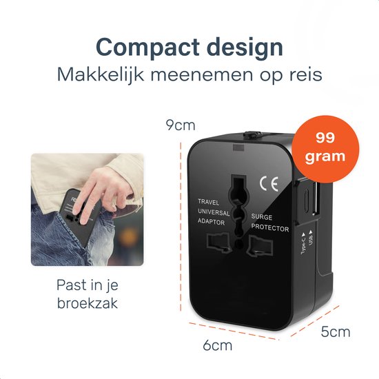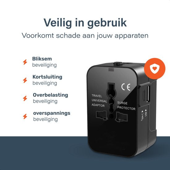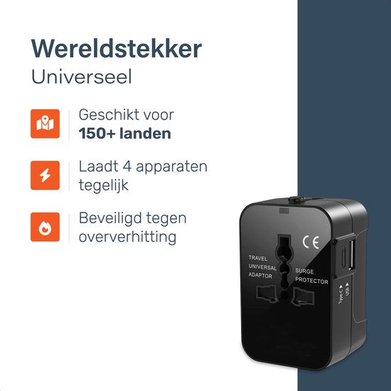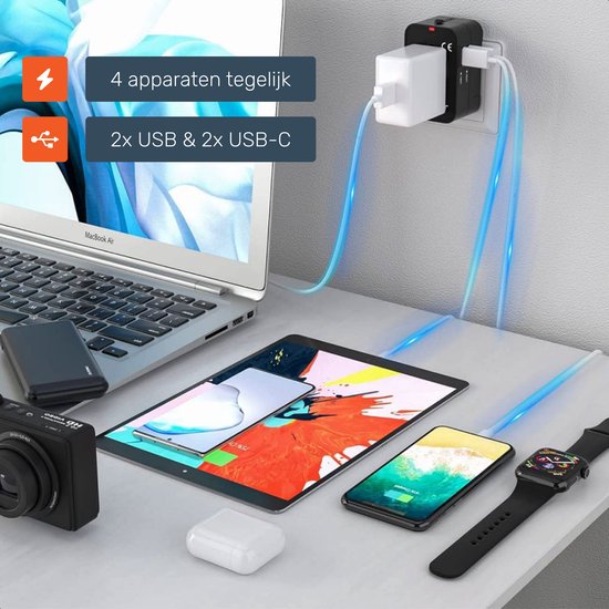 Universal World Plug 150+ Countries - International - Conversion - Travel plug - Adaptateur - Pour l'Amérique, l'Amérique du Sud, l'Angleterre (UK), l'Asie, l'Europe, l'Afrique, l'Italie, la Thaïlande, Curaçao - 2x USB-C et 2x USB-A - Type G, Léger - Skoo