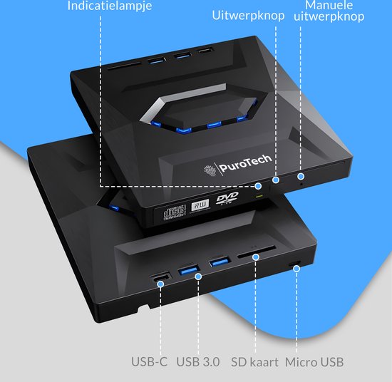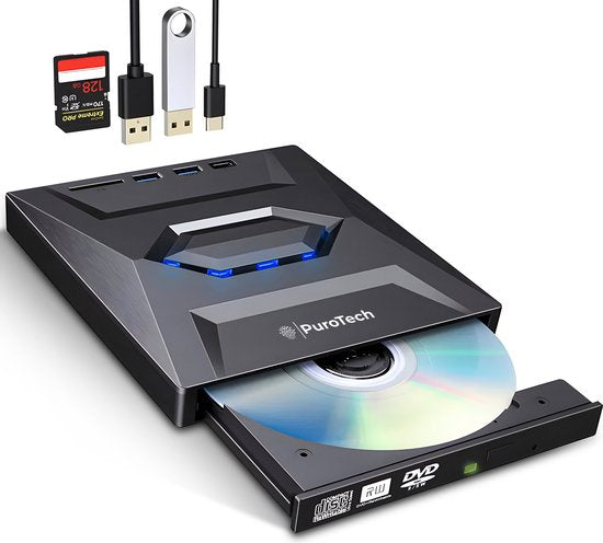 PuroTech Lecteur DVD/CD externe 3-en-1 pour ordinateur portable et PC - Graveur - Lecteur optique - USB 3.0 & USB C- Plug & Play - Windows, MacOS & Linux