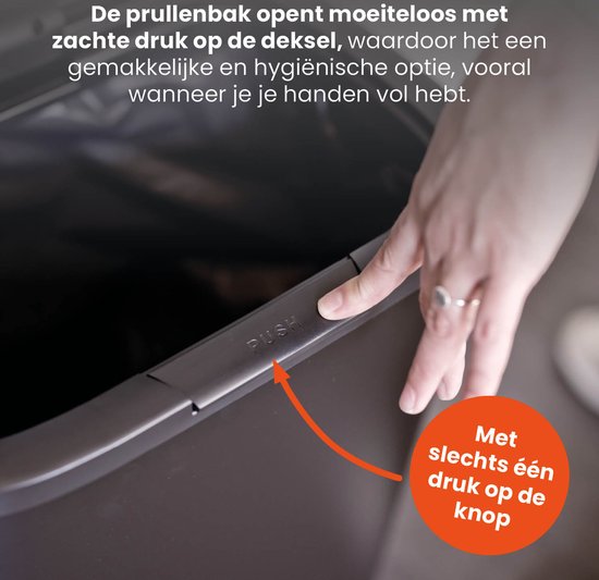 Cette poubelle s'ouvre sans effort grâce au bouton 'push' situé sur le couvercle, faisant de l'élimination des déchets une expérience simple et propre, même lorsque vous avez les mains pleines. Avec un volume de 55 litres, vous aurez beaucoup de place, ce qui vous évitera de changer de sac poubelle aussi souvent.