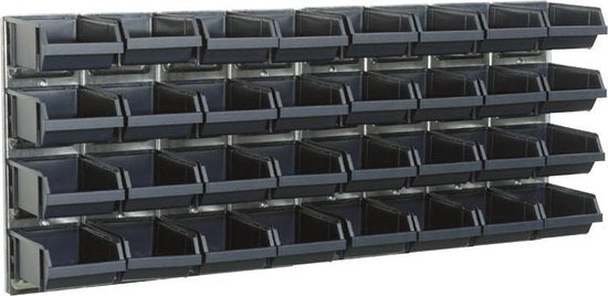 Deux tableaux à outils Raaco avec 32 bacs de rangement. Ces tableaux peuvent être installés indépendamment l'un de l'autre, soit l'un au-dessus, soit l'un au-dessous de l'autre. Les bacs sont faciles à fixer sur le panneau mural. Les dimensions exactes sont hxwxd : 440 x 1040 mm. Les bacs inclus sont les Raaco 3-160 avec des dimensions de 50 x 125 x 133 mm. Ces bacs sont également disponibles séparément.