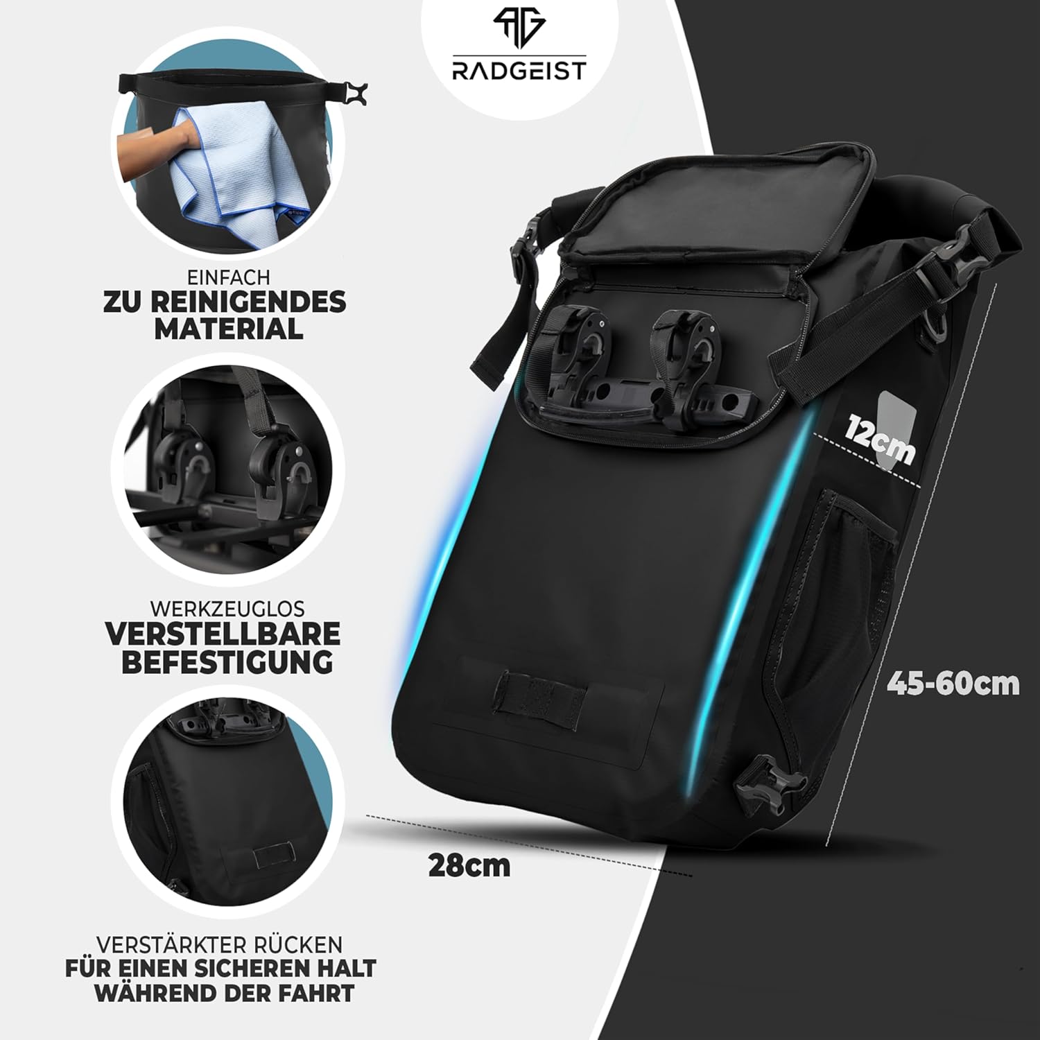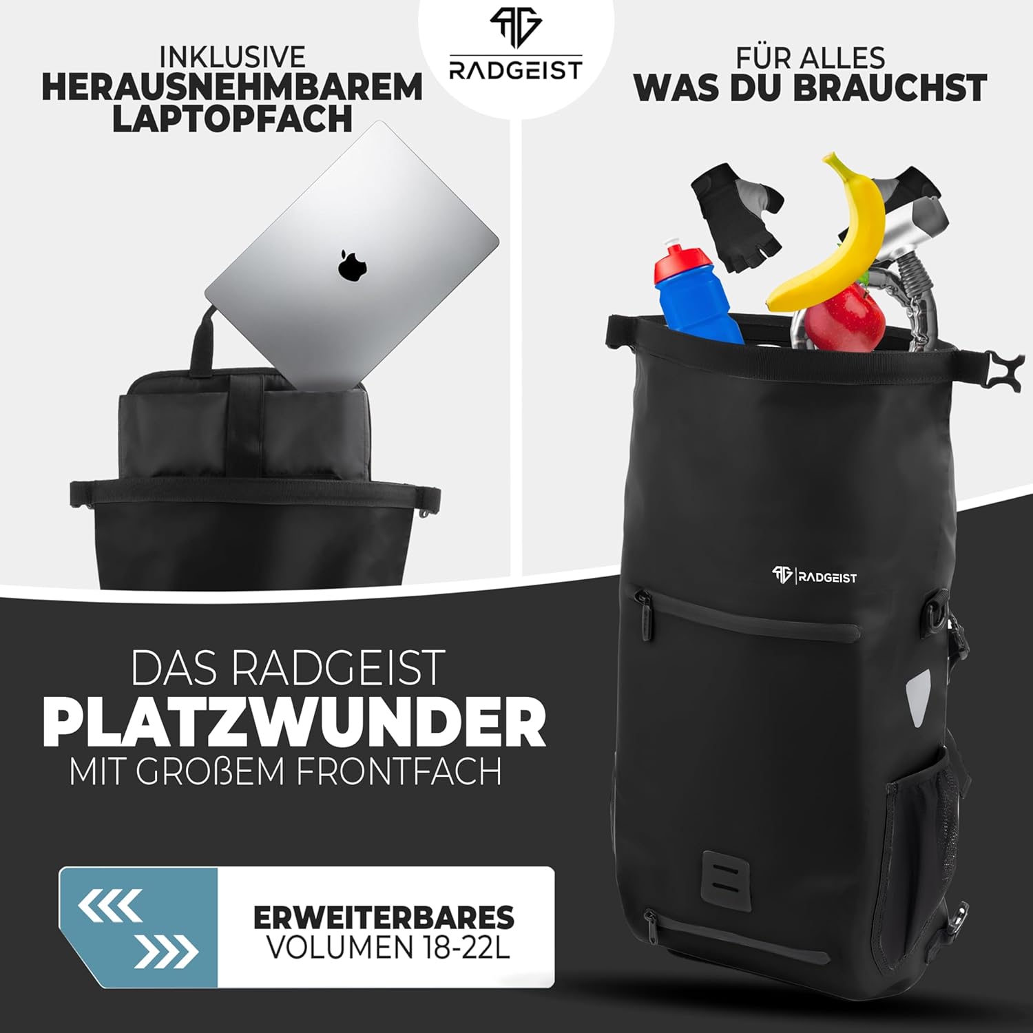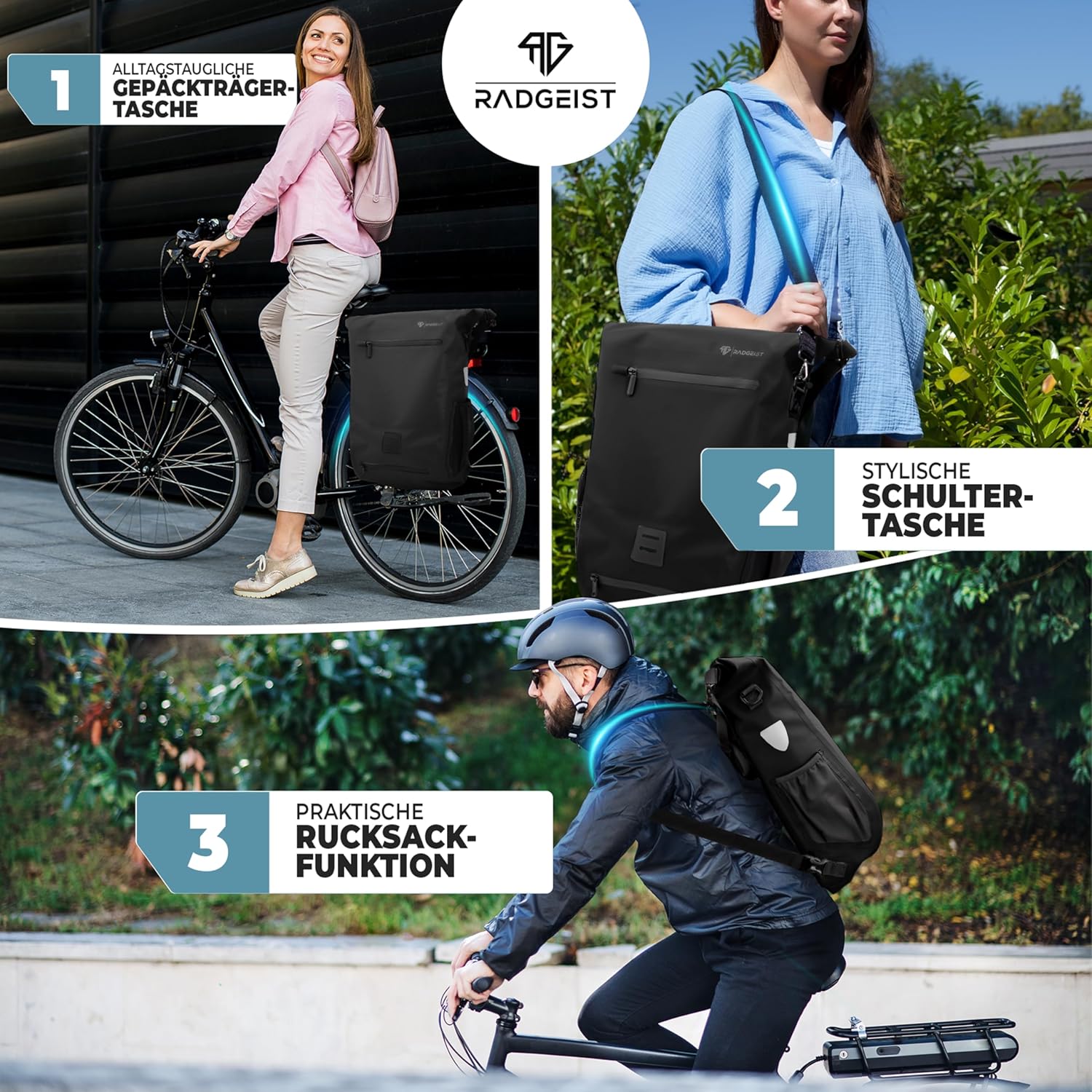 RADGEIST 3in1 bike bag for carrier I sac à vélo, sac à dos et sac à bandoulière 18-22L I sac pour vélo 100% étanche noir