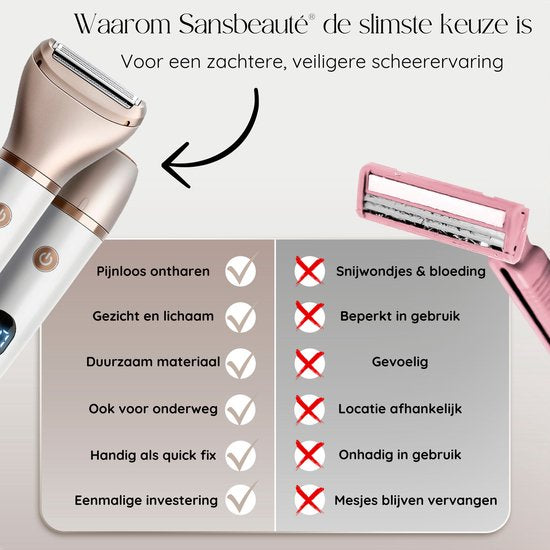 Vous en avez assez des poils indésirables sur votre visage et votre corps ? Vous en avez assez des rasoirs douloureux ? Voici le rasoir pour femmes 2 en 1 Sansbeauté® ; Pink Edition - la solution ultime pour une peau douce et soyeuse. Grâce aux deux têtes de rasage différentes, vous pouvez désormais épiler sans douleur tous les poils de votre visage et de votre corps. Et grâce aux deux accessoires, vous disposez de tout dans één ensemble pratique, ce qui le rend également financièrement attrayant ! Les icônes LED sur l'appareil permettent de savoir quand il faut le nettoyer et le recharger. Et ce n'est pas tout ! Cet appareil sans fil est entièrement étanche, vous pouvez donc l'utiliser sous la douche ou le nettoyer rapidement sous le robinet. Il est tout simplement indispensable dans les situations d'urgence ! Mais ce n'est pas tout. Si vous commandez maintenant, vous recevrez un e-book exclusif contenant de précieux conseils pour vous aider à utiliser au mieux le produit et à obtenir les meilleurs résultats. Alors, qu'attendez-vous ? Commandez dès aujourd'hui le rasoir pour femmes 2 en 1 Sansbeauté® ; et profitez d'une peau lisse et sans poils, sans effort ni douleur ! Vos avantages en un coup d'œil : ✓ Profitez d'un rasage sans douleur - Le Sansbeauté2-in-1 Ladyshave assure une épilation en douceur des poils indésirables sur votre visage et votre corps, sans blessures gênantes ni irritations douloureuses. Grâce aux couches protectrices supplémentaires des têtes de rasage, vous vous rasez sans effort et sans souci. Dites adieu aux lames émoussées, aux rasages inconfortables, aux éruptions cutanées dues au rasage, aux poils incarnés, et profitez d'une peau douce et soyeuse, sans aucune irritation. Même si vous avez la peau sensible, ce rasoir féminin est fait pour vous ! ✓ La solution tout-en-één (multifonctionnel) - Dites adieu aux différents rasoirs pour chaque partie du corps ! Avec le Sansbeauté2-in-1 Ladyshave, vous pouvez éliminer tous les poils indésirables de votre visage et de votre corps sans aucune irritation de la peau. Les deux têtes de rasage différentes vous permettent de raser sans douleur le maillot, les aisselles, les bras, les jambes et même le visage. La tête ronde vous permet d'épiler facilement le visage et la tête en forme de V convient à l'épilation du corps. Pourquoi se contenter d'un rasoir één quand vous avez tout en één avec le Sansbeautéladyshaver ? Préparez-vous à avoir une peau lisse et sans poils sans l'expérience douloureuse du rasage. ✓ Liberté ultime (sec et humide) - Que vous préfériez le rasage à sec ou le rasage humide avec mousse, le Sansbeauté ; Ladyshave vous donne la liberté de vous raser à votre guise ! L'appareil étanche vous permet de vous raser n'importe où, même en camping, et il est également idéal pour un rasage rapide sous la douche ou dans le bain. De plus, l'appareil se nettoie facilement sous le robinet. Découvrez la liberté ultime et rasez-vous à votre guise avec le Sansbeauté ; Ladyshave ! ✓ Profitez d'une qualité de rasage inégalée - Le Sansbeauté ; 2-en-1 Ladyshave est fabriqué à partir de matériaux de la plus haute qualité et dispose d'une technologie avancée pour une expérience de rasage sûre, efficace et précise. Les têtes de rasage sont durables et restent aiguisées pendant longtemps. Vous n'aurez donc plus à vous battre avec des lames émoussées ou des irritations de la peau. Investissez dans la meilleure qualité et profitez d'un rasage confortable et sans effort, à chaque fois ! ✓ Achat à long terme (têtes de rasoir de remplacement) - Grâce à la qualité exceptionnelle de nos têtes de rasoir, nos clients bénéficient d'une performance à long terme qui dure généralement entre 6 mois et 1 an. La durée exacte peut varier, en fonction de la fréquence de rasage et du type de pilosité. Vous pouvez acheter des têtes de rasoir de remplacement rapidement et en toute sécurité via bol.com. ✓ Épilation rapide et facile (gain de temps) - Le temps est précieux, c'est pourquoi nous avons conçu le Sansbeauté ; 2-in-1 Ladyshave Edition pour une épilation sans effort et un gain de temps. Avec notre rasoir pour femmes, vous n'avez plus besoin de passer des heures à raser différentes parties du corps. Grâce aux têtes de rasage et à la technologie avancée de l'appareil, l'épilation est plus facile et plus rapide que jamais. Vous n'avez plus besoin de vous raser sans cesse avec un rasoir ; gagnez du temps et épilez-vous sans effort avec notre Ladyshave Edition 2-en-1. ✓ Une solution parfaite pour un mode de vie actif (solution rapide avec verrou de voyage) - Vous êtes toujours en déplacement et vous avez peu de temps pour vous préparer ? Ou vous cherchez simplement un moyen plus rapide de vous épiler sans tracas ? Gagnez du temps et obtenez une peau lisse et douce en quelques minutes. Grâce à son verrou de voyage pratique et à son design léger, vous pouvez facilement emporter le rasoir Sansbeauté ; Ladyshave n'importe où. De plus, un sac de rangement gratuit est inclus pour garder l'appareil en sécurité et organisé lors de vos déplacements. Toujours la solution rapide et parfaite à portée de main, où que vous alliez ! ✓ Fini les rasoirs jetables - Nos lames innovantes et nos accessoires multifonctionnels offrent une solution aux coûteux rasoirs jetables ! Économisez de l'argent sur les épilateurs en vrac et arrêtez de remplacer régulièrement les lames de rasoir émoussées. Nos accessoires et lames de rasage durables et efficaces sont l'investissement parfait pour une peau lisse et douce sans le coût du remplacement constant des lames de rasoir jetables. Économisez sur d'autres coûts Avoir un look parfait ne doit pas être coûteux. Avec le rasoir 2 en 1 Sansbeaut, vous économisez de l'argent à long terme car vous n'avez plus besoin d'aller au salon pour des traitements coûteux d'é