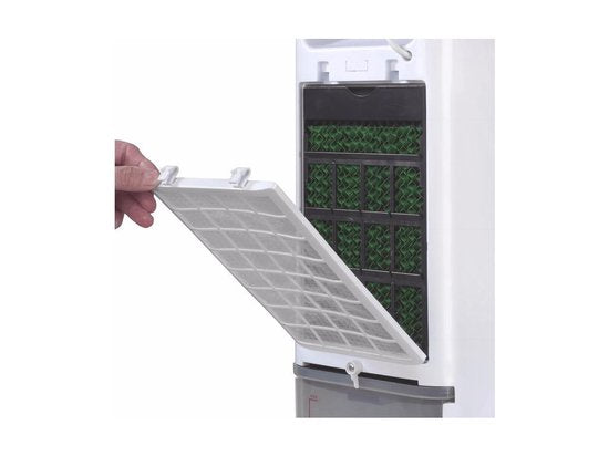 Un rafraîchisseur d'air, contrairement à un climatiseur...mobile, fonctionne sans l'utilisation d'un compresseur ou d'une pompe à chaleur. Le principe de fonctionnement est le suivant : À l'intérieur du refroidisseur d'air, l'eau s'écoule à travers une grille ou est guidée. L'air chaud est expulsé de la pièce par cette grille. Ce processus entraîne l'évaporation de l'eau, ce qui refroidit considérablement l'air. Le refroidisseur d'air délivre alors une brise rafraîchissante. Grâce à ce fonctionnement, les rafraîchisseurs d'air conviennent parfaitement aux pièces où l'on aime laisser les fenêtres ouvertes pendant les journées chaudes. Même dans des environnements mal isolés et pleins de courants d'air, comme une tente militaire, les rafraîchisseurs d'air fonctionnent de manière optimale.