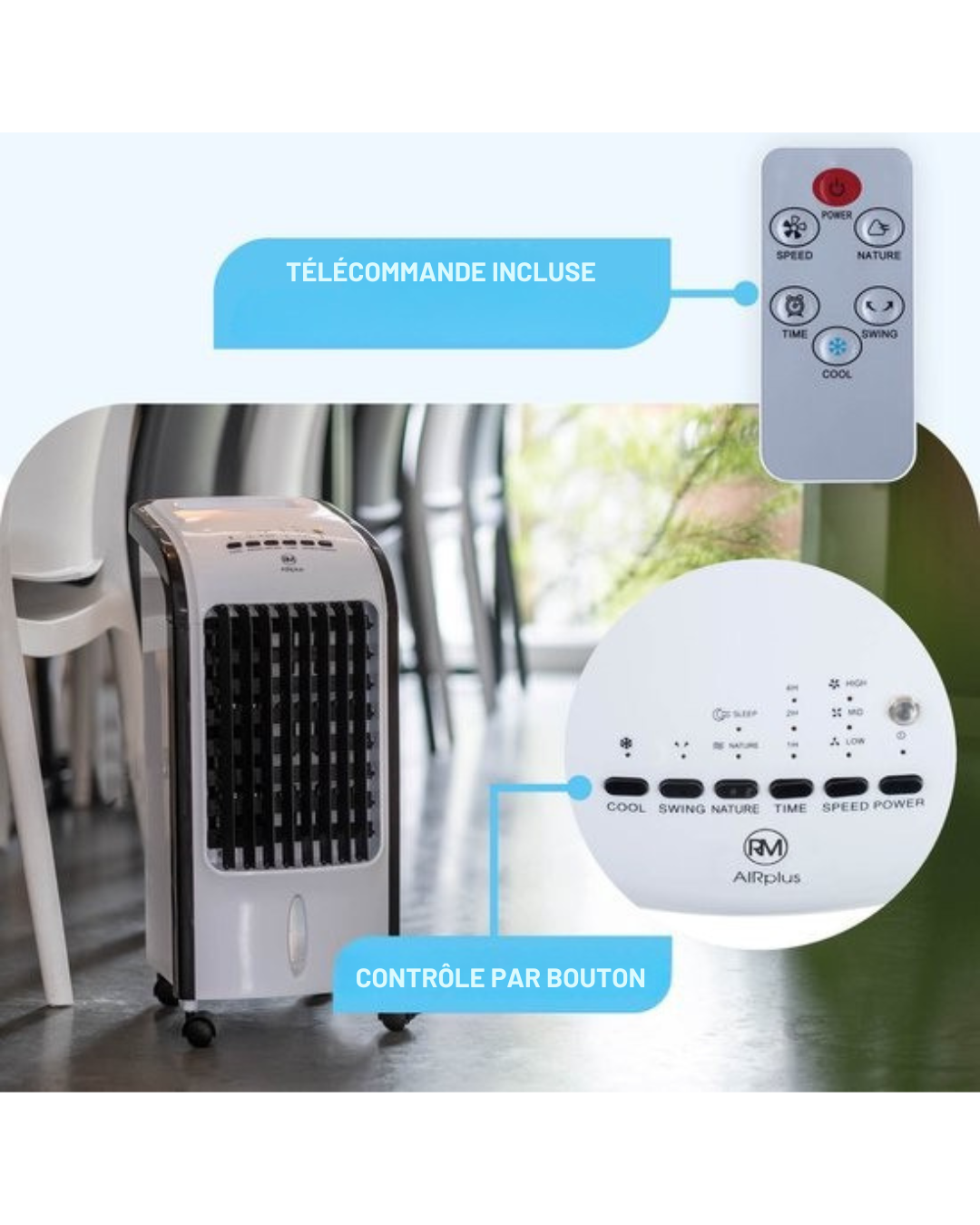 La télécommande vous permet de faire fonctionner facilement le rafraîchisseur d'air RMAP-3701 depuis le confort de votre fauteuil, mais...Les boutons poussoirs situés sur le dessus de l'appareil permettent de sélectionner facilement les réglages souhaités. Ce rafraîchisseur d'air est équipé d'une fonction d'oscillation, idéale pour une dispersion optimale de l'air frais.