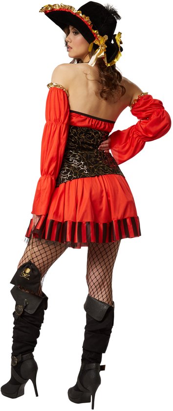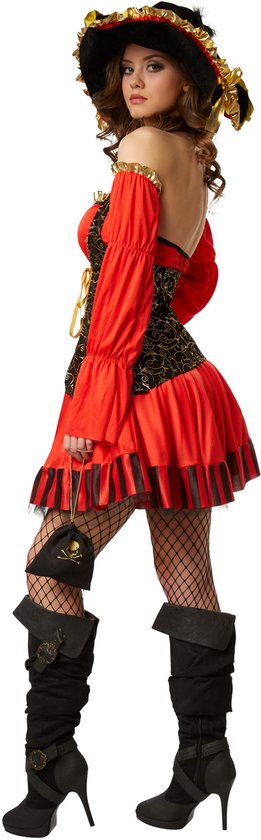 En tant que capitaine pirate séduisante, vous serez toujours la gagnante de chaque bataille navale. La tenue enchanteresse avec la robe courte et le corset orné d'or est parfaitement ajustée. Dans ce déguisement élégant, vous avez à vos côtés une équipe complète d'hommes déterminés, prêts à vous rejoindre dans de nouvelles aventures en mer.