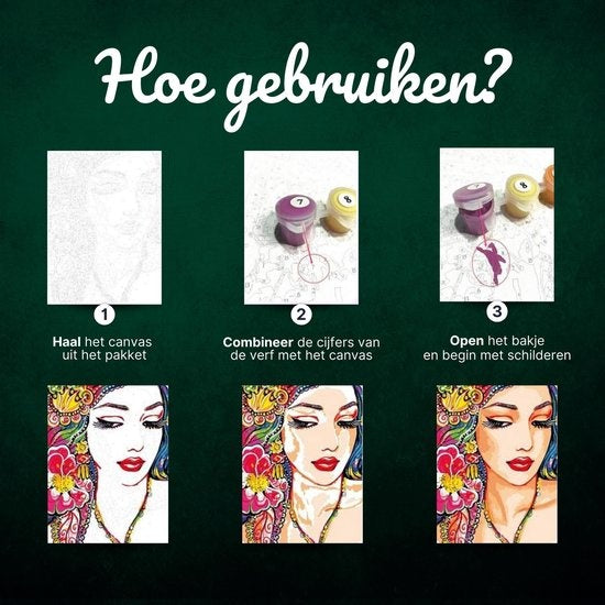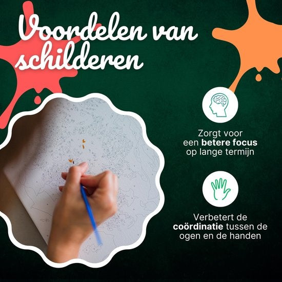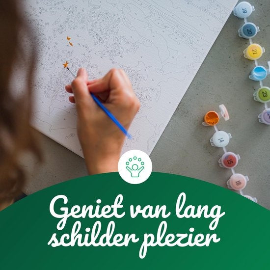 La peinture par numéros est le nouveau hobby à la mode aux Pays-Bas et en Belgique. La toile contient des cases numérotées qui forment ensemble le tableau. Avec la peinture acrylique et les pinceaux inclus, vous pouvez maintenant créer une belle œuvre d'art vous-même.