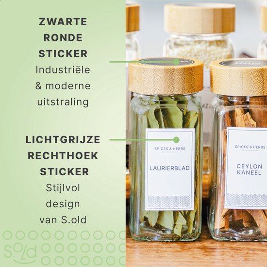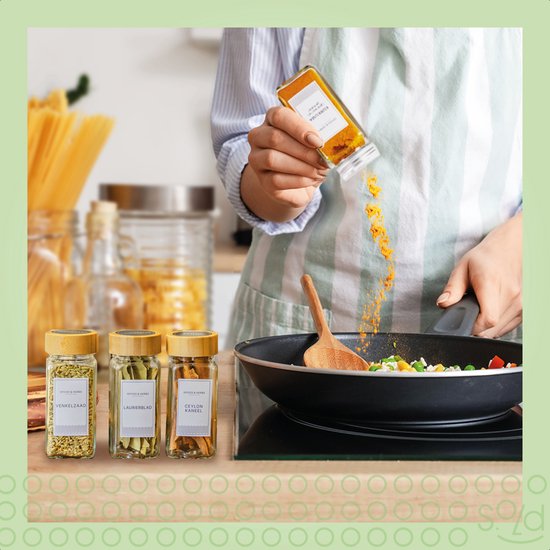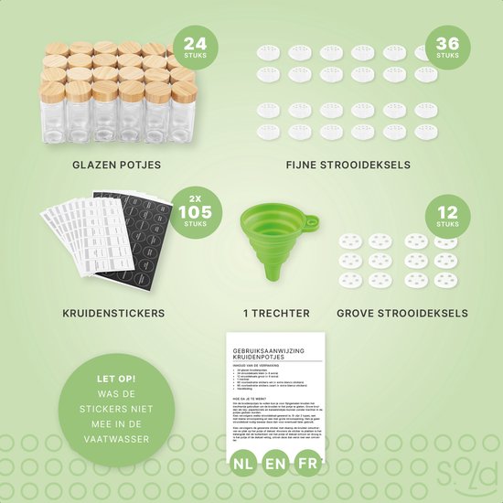 Ce set complet comprend 24 pots à épices en verre avec 24 couvercles verrouillables en bambou, ainsi que des couvercles à saupoudrer pour les épices fines et les épices grossières. Deux types d'étiquettes pré-imprimées sont également disponibles, que vous pouvez utiliser sur les couvercles et/ou sur le devant des bocaux. Les deux types d'étiquettes offrent un choix de plus de 100 épices différentes. Enfin, l'ensemble comprend un entonnoir en silicone, qui rend le remplissage des herbes facile et pratique.