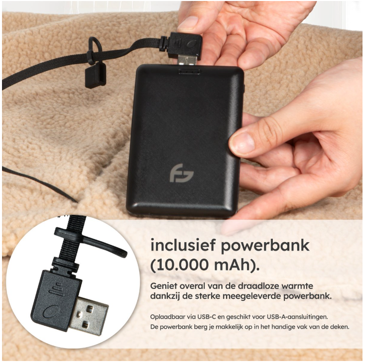 La couverture chauffante de Saaf est conçue pour une flexibilité maximale. Grâce à la puissante batterie de 10 000 mAh incluse, vous n'êtes plus lié à une prise murale. Vous pouvez facilement connecter la couverture via USB et l'emmener partout. Avec 3 réglages de chaleur, vous décidez de la température souhaitée, qui peut atteindre jusqu'à 55°C. La couverture est idéale comme chauffage de siège, mais elle peut également être posée sur les jambes ou le dos.