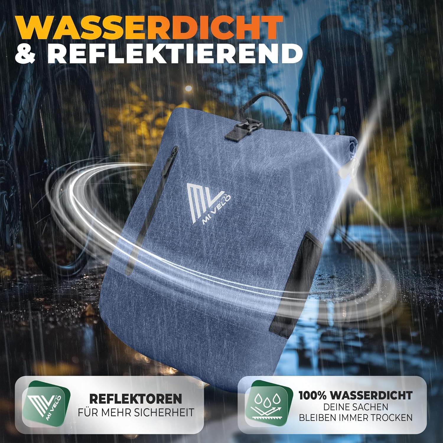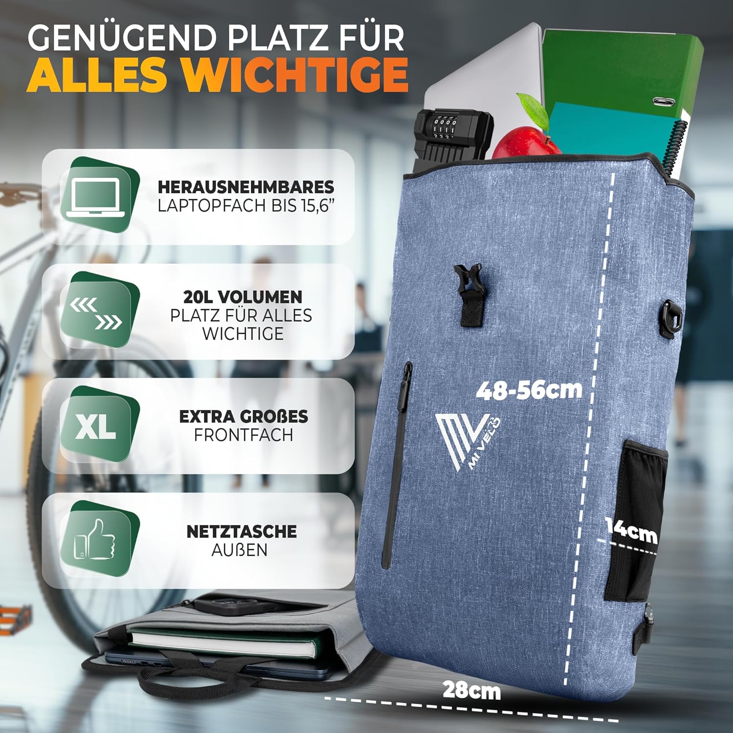 MIVELO Sacoche à vélo étanche 3-en-1 avec compartiment pour ordinateur portable et serrure - sans PVC - Bleu Jeans - 20 L