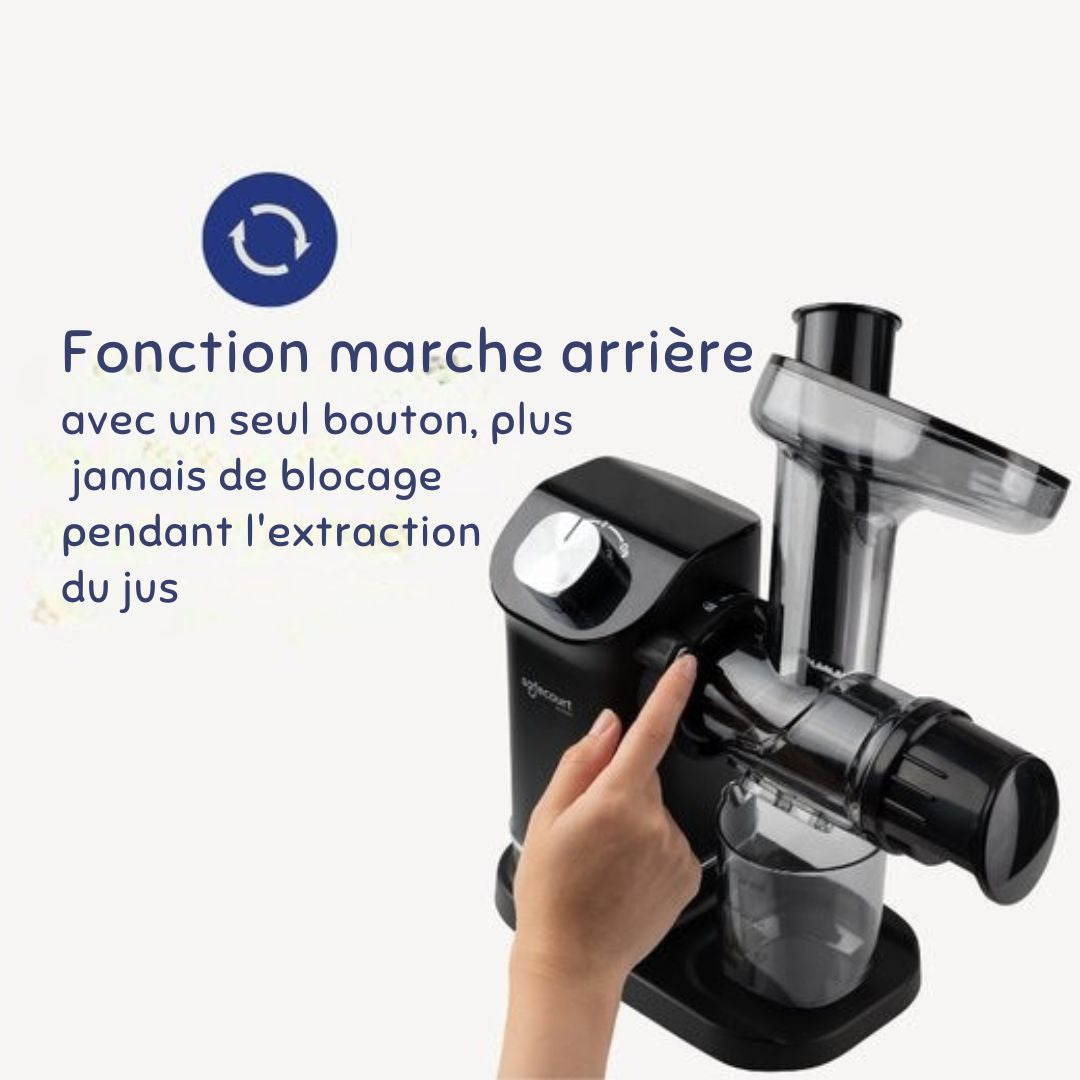 Grâce à son moteur de 150 W fonctionnant à 110 tours par minute, il garantit une extraction lente qui limite l’oxydation et préserve les vitamines, minéraux et enzymes essentiels. Le niveau sonore est maîtrisé à 70 dB, ce qui permet une utilisation confortable à tout moment de la journée, y compris le matin.