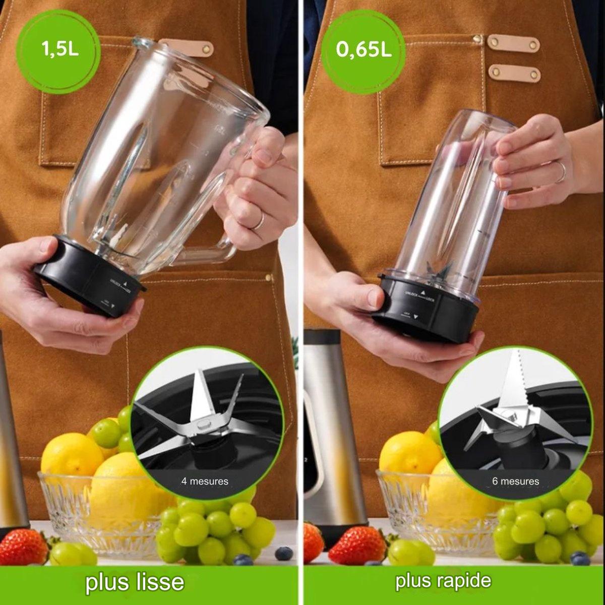 - Bocal en verre durable de 1,5 L, résistant à toutes les tâches de mélange