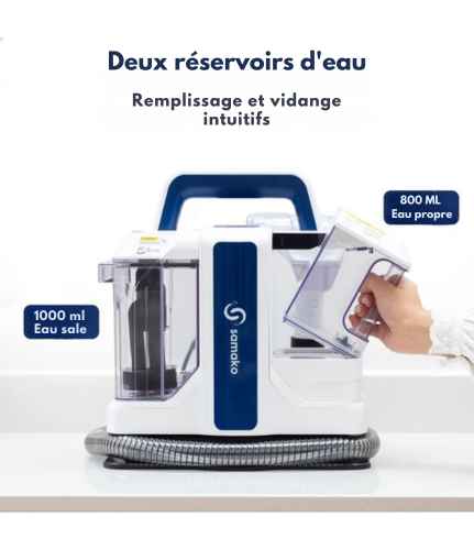 Le nettoyeur de tapis Samako est équipé de 2 réservoirs d'eau amovibles pratiques, vous permettant de remplir l'eau sans effort et d'éliminer l'eau sale. Avec un spacieux réservoir d'eau propre de 1,3 litres et un pratique réservoir d'eau sale de 0,5 litres, vous disposez d'une capacité suffisante pour nettoyer en profondeur même les grandes surfaces. Le nettoyeur de tapis automatiquement pulvérise de l'eau propre sur la surface et aspire ensuite l'eau sale, qui est stockée en toute sécurité dans le réservoir d'eau sale. Cette action d'aspiration directe garantit un séchage rapide de la surface nettoyée, ce qui vous permet de profiter rapidement de résultats frais