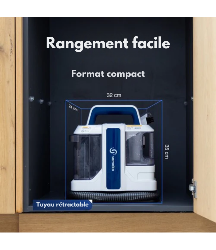 Avec un cordon de 5 mètres et un tuyau flexible, vous bénéficiez d'une totale liberté de mouvement pendant le nettoyage. Le nettoyeur de taches Samako est compact et facile à utiliser, idéal pour les personnes qui veulent des résultats rapides. Grâce à sa conception de stockage facile, le vidage et le remplissage sont un jeu d'enfant, de sorte que vous pouvez continuer à nettoyer sans effort et sans interruptions inutiles.