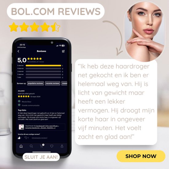 À Sansbeauté, vous obtenez plus qu'un simple sèche-cheveux avec diffuseur. En plus de l'appareil, vous recevrez un e-book rempli de conseils de coiffure, un manuel en néerlandais par e-mail et des conseils pratiques pour commencer. Vous recevrez également un support de suspension et 2 peignes pour optimiser votre routine de coiffage. Pour toute question, nous restons à votre disposition à support@sansbeaute.nl