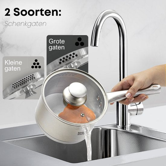 Chaque couvercle est doté d'un double trou d'écoulement, ce qui est pratique pour égoutter les pâtes ou les légumes. La soupape à vapeur aveugle empêche la surcuisson, et la construction en verre vous permet de suivre le processus de cuisson sans perdre de chaleur.