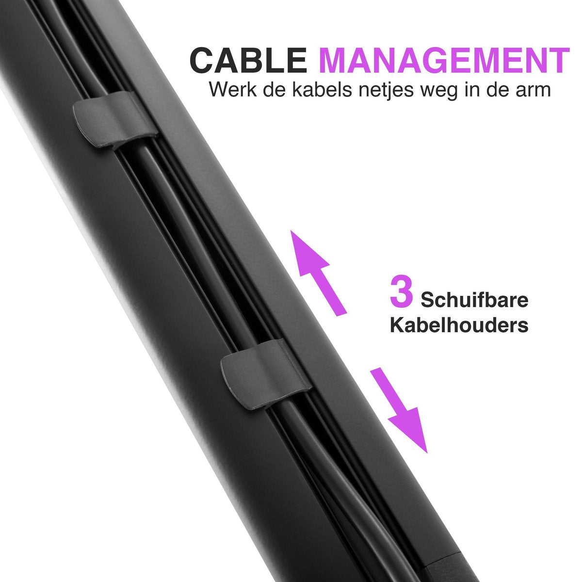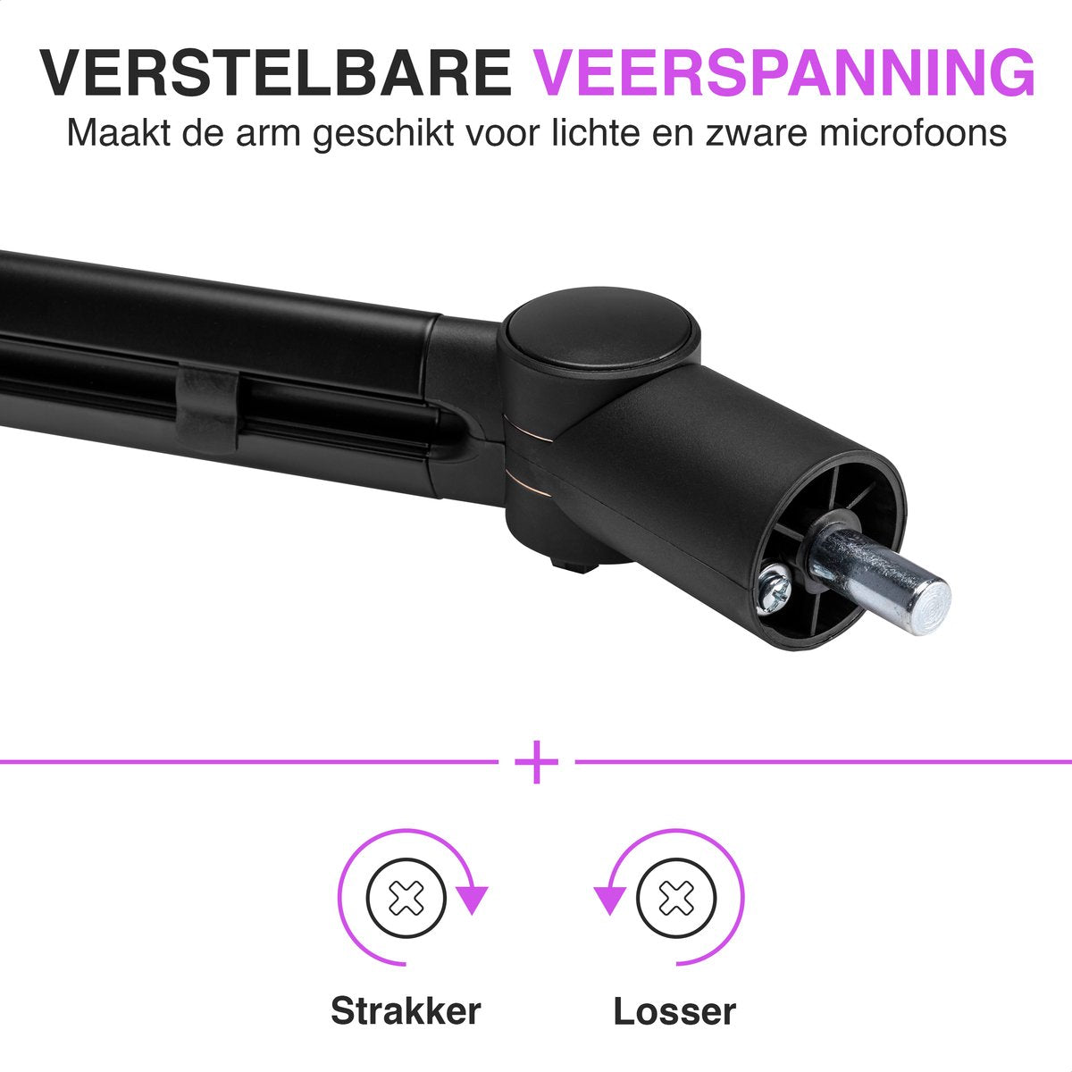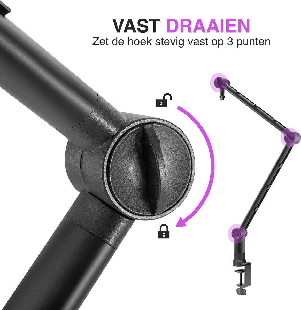 Le bras de la perche reste toujours en place grâce à la pince de table en métal robuste. La table sur laquelle vous fixez le bras de microphone doit avoir une épaisseur minimale de 1,8 cm. Pour les deux pinces de table, le centre de gravité du bras est situé au-dessus de votre bureau, ce qui garantit une meilleure stabilité. Avec de nombreuses autres pinces de table, ce centre de gravité se trouve juste au-dessus du bureau, ce qui entraîne un affaiblissement après une utilisation prolongée.