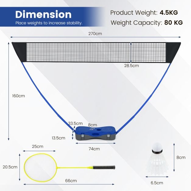 Bullet Point:Ensemble de badminton tout-en-un: Notre ensemble de filet de badminton avec base de rangement comprend un ensemble complet incluant un support de filet de badminton de 270cm, une boîte de rangement, 2 raquettes de badminton, 2 volants, et 2 poteaux. C'est un excellent cadeau pour les enfants, la famille et les amis pour passer plus de temps à jouer. Portable pour un transport facile: Avec une boîte de transport durable, elle est assez grande pour que vous puissiez y mettre tous les ensembles pour une meilleure protection et un meilleur stockage. Adoptant un design portable et léger, il est pratique de le mettre dans le coffre et de l'emmener partout avec soi. Haute qualité et matériaux sélectionnés: Le volant en mousse EVA est fabriqué à partir de matériaux de première qualité, ce qui le rend moins susceptible de s'user et de se déformer, et lui permet de reprendre rapidement sa forme. Avec une construction métallique robuste et une poignée ergonomique, la raquette de badminton est fabriquée en nylon durable pour les besoins sportifs quotidiens. Le filet PE sélectionné pour tous les temps est également durable.