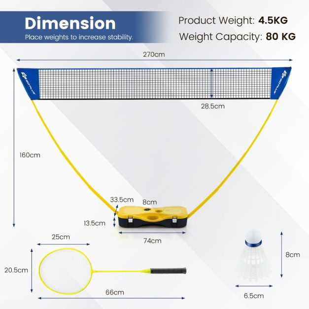 Coast Portable Badminton Set Yellow - 270 x 160 cm - avec filet, 2 raquettes, 2 volants et boîte de rangement - intérieur et extérieur