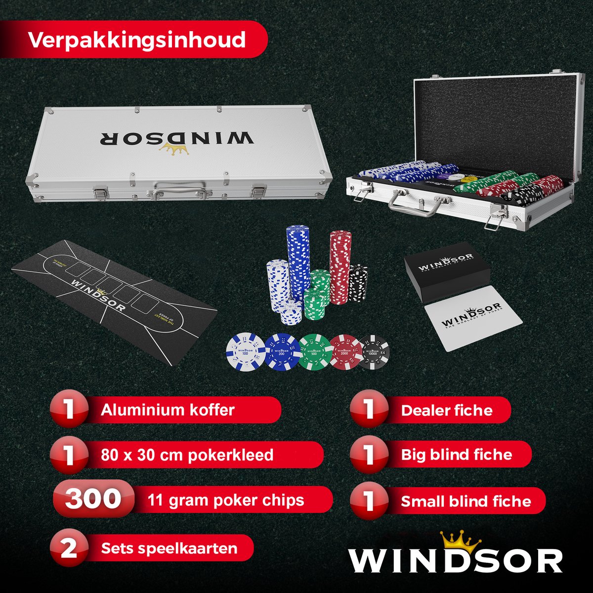 Set de poker Windsor - 300 jetons - Tissu de poker - Blinds - Cartes - Jetons de poker - Jetons de poker