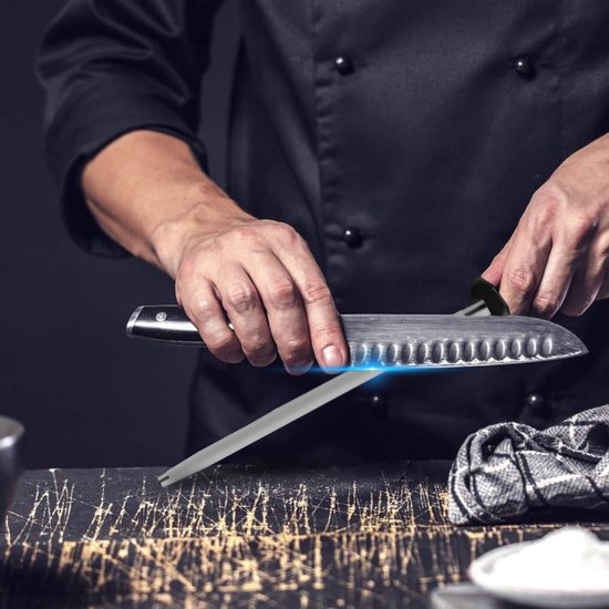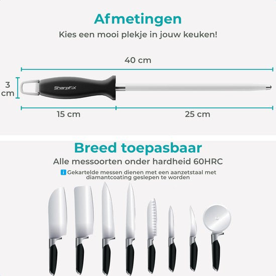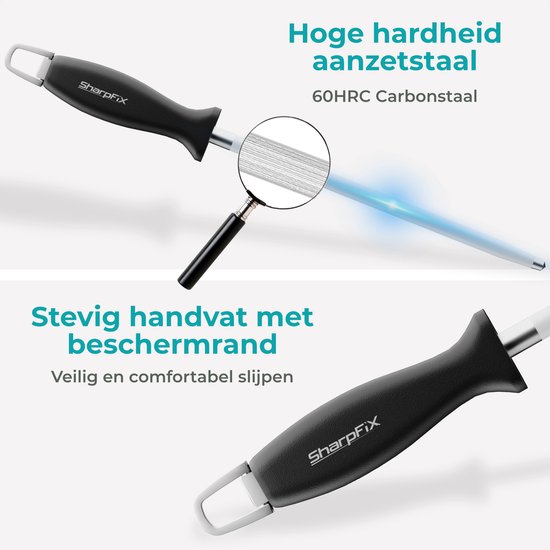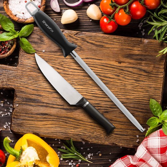 L'acier à aiguiser SharpFix permet de rendre tous vos couteaux à nouveau tranchants, sans effort ni temps d'aiguisage prolongé. Grâce à sa dureté de 60 HRC, ce fusil à aiguiser est parfait pour les couteaux de haute qualité utilisés fréquemment.