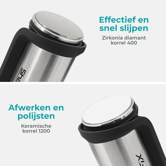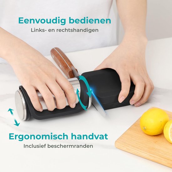 Cet aiguiseur de couteaux présente un large dessous antidérapant résistant aux rayures et est équipé d'un rouleau ergonomique qui tient confortablement dans la main. L'aiguisoir reste ainsi stable et sûr pendant l'aiguisage, ce qui signifie qu'un gant d'aiguisage supplémentaire n'est pas nécessaire.