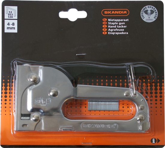 L'agrafeuse, également appelée agrafeuse manuelle ou pistolet à agrafes, fonctionne grâce à un système de ressort qui insère des agrafes dans différents matériaux. Cet appareil convivial peut être utilisé d'une seule main. Ce modèle particulier est entièrement fabriqué en métal léger et est compatible avec les agrafes de types 53, 053 et 530 dans les tailles : 4 mm, 6 mm et 8 mm.
