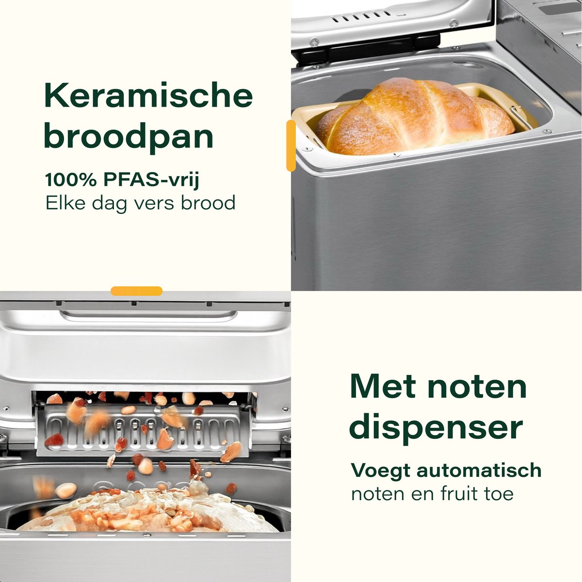 Le Skoov Bakemaster vous décharge de tout le travail : du pétrissage de la pâte à la cuisson et au maintien au chaud du pain. Grâce au distributeur automatique, vous ajoutez des noix ou des raisins secs exactement au bon moment, sans avoir à rester sur place.