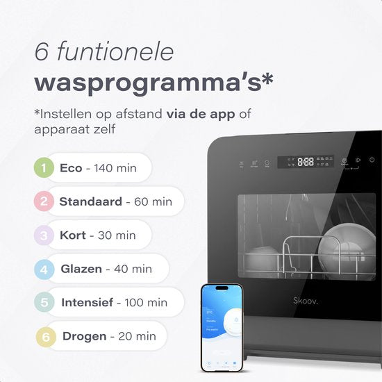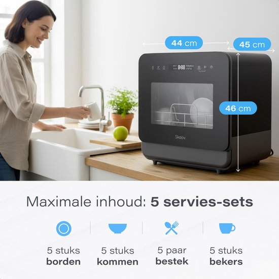 Pas de place pour un grand lave-vaisselle, mais fatigué de faire la vaisselle tous les jours ? Le Lave-vaisselle Skoov Mini est la solution parfaite pour les petites cuisines, les studios, les résidences étudiantes, les petites maisons, les camping-cars et les caravanes. Ce lave-vaisselle compact à poser offre une puissance remarquable, fonctionne très silencieusement et ne consomme que 5 litres d'eau par cycle. Efficace, écologique et immédiatement prêt à l'emploi sans installation.