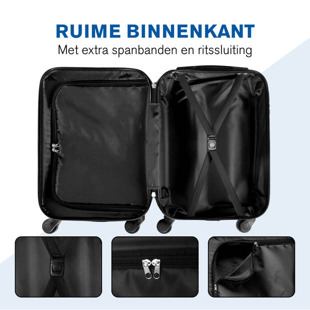 Dans ce set de valises, le bagage à main et la valise de soute sont dotés de 4 roues pivotant à 360 degrés. Cela vous permet de les manœuvrer facilement dans l'aéroport. En outre, les deux valises du set de valises 2 pièces sont dotées d'une poignée extensible qui vous permet de tirer facilement le set de valises de voyage derrière vous. Enfin, la valise de grande contenance est également dotée d'une poignée sur le côté, ce qui permet de la placer facilement sur la ceinture porte-bagages et de l'en retirer facilement.