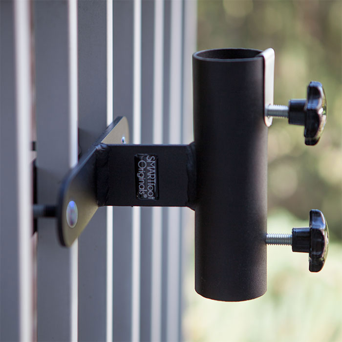Cette pince de balcon de Smartfoot originals est extrêmement facile à utiliser. À l'aide des boulons, la pince peut être fixée solidement autour des barres du balcon. Le parasol peut ensuite être serré dans le tube à l'aide des deux boutons rotatifs.