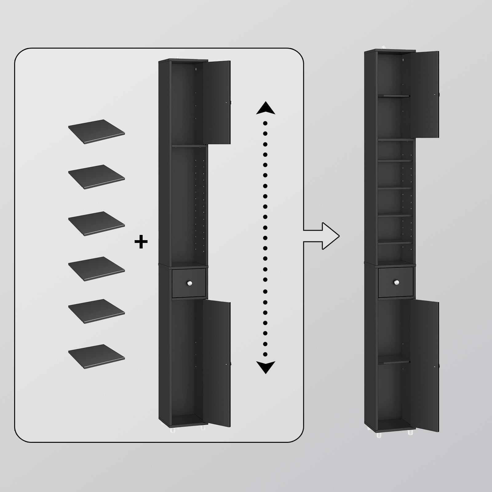 SoBuy Grand meuble de salle de bain étroit avec tiroir et étagères réglables - Meuble colonne noir pour salle de bain et salon - 20 x 20 x 180 cm
